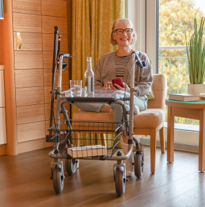 - Gehwagen mit Sicherheitsrahmen: Diese spezielle Art von Gehwagen ist besonders für Personen mit Orientierungsschwierigkeiten oder einem hohen Sturzrisiko konzipiert. Sie verfügen über einen umlaufenden Sicherheitsbügel und oft auch einen Sitz, um ein sicheres Geh-Training zu ermöglichen und die Angst vor Stürzen zu nehmen. Diese Gehwagen haben eine wichtige Brückenfunktion zwischen einem Rollator und einem Rollstuhl und eignen sich ideal für den Einsatz im Innenbereich.